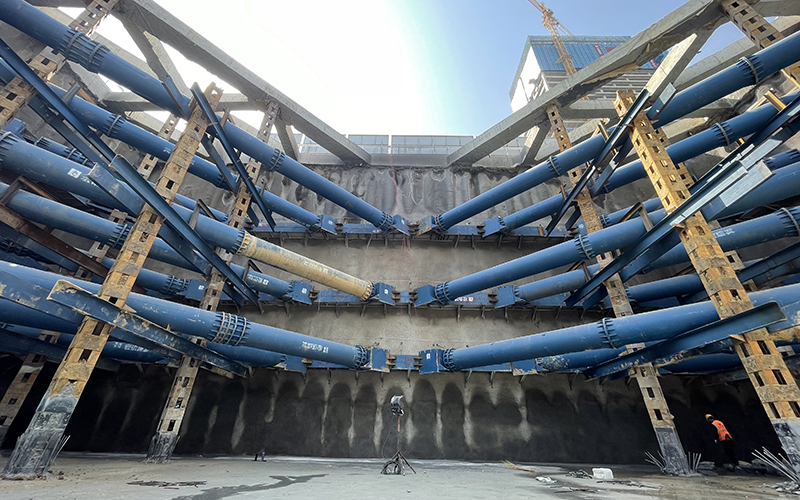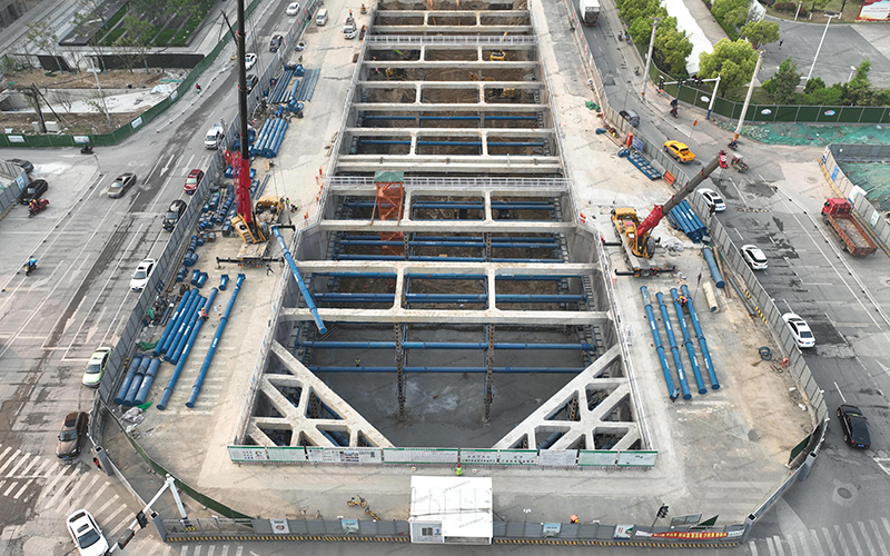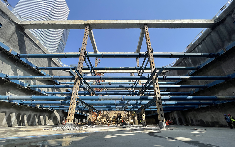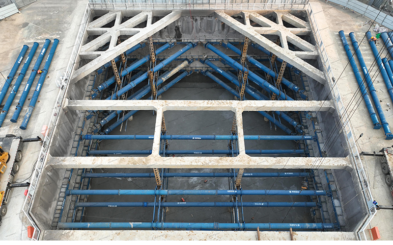 雙層段基坑深度17m,縱向長(zhǎng)度32m,橫向長(zhǎng)度33.8m。深基坑作業(yè)危險(xiǎn)因素眾多,為保障基坑安全開(kāi)挖,項(xiàng)目在開(kāi)挖前進(jìn)行多次模擬推演,預(yù)估風(fēng)險(xiǎn)源并不斷優(yōu)化施工方案。開(kāi)挖過(guò)程中遵循時(shí)空效應(yīng),采取“先撐后挖、水平分段、豎向分層”原則,做到“分層、分步、對(duì)稱(chēng)、平衡、限時(shí)”五個(gè)要點(diǎn),雙層下穿段土方量1.9萬(wàn)m3,經(jīng)過(guò)連續(xù)作業(yè)4月16日完成基坑開(kāi)挖并通過(guò)五方責(zé)任主體單位基坑驗(yàn)槽,4月19日完成墊層混凝土澆筑。