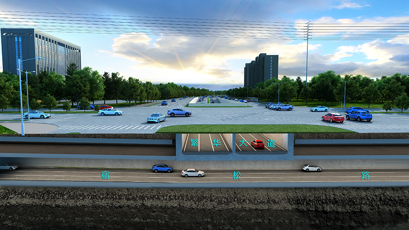 宿松路2標(biāo)全長2815m,北起繞城高速,下穿壩下路、繁華大道、軒轅路,上跨花園大道、南至慈光路。宿繁交口新建雙層下穿隧道,宿松路隧道位于負(fù)二層,長1250m,繁華大道隧道位于負(fù)一層,長349m。新建花園大道跨線橋一座,長420m;同時(shí),新建壩下路、智能科技園人行天橋2座。