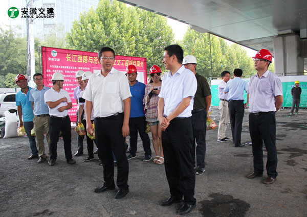 7月28日下午,合肥市副市長(zhǎng)寧波在市重點(diǎn)局局長(zhǎng)張家祥、副局長(zhǎng)鄭浩、安徽省交通建設(shè)股份有限公司(以下簡(jiǎn)稱安徽交建)總裁高楊等人的陪同下,蒞臨安徽交建長(zhǎng)江西路與沿線道路立交工程項(xiàng)目施工現(xiàn)場(chǎng),慰問(wèn)奮戰(zhàn)在高溫一線的道路建設(shè)者們。