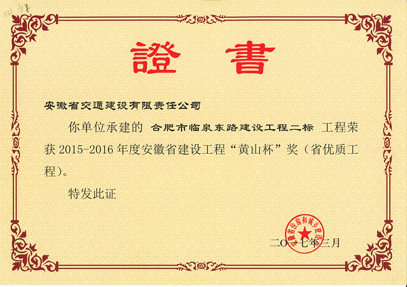 安徽省建設工程“黃山杯”獎是安徽省建筑行業(yè)建設工程質(zhì)量的最高榮譽獎,黃山杯的評選對象為安徽省建筑施工企業(yè)在中國境內(nèi)承包、已經(jīng)建成并投入使用的各類工程,工程質(zhì)量標準需達到省內(nèi)一流水平。安徽交建自成立以來,積極調(diào)整發(fā)展思路,不斷加快市場開拓步伐,重點強化項目管理全過程控制,做好工程進度、質(zhì)量、安全和現(xiàn)場文明施工管理,營造了良好的企業(yè)形象。