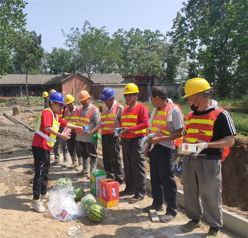 施工加速度的背后是汗水。在五一期間,界首市氣溫連續(xù)一周高達(dá)36℃,項目部完善高溫作業(yè)應(yīng)急處理預(yù)案,合理安排作息時間,減少了白天室外作業(yè)時間,披星戴月、節(jié)假無休的搶工模式也成了家常便飯?!翱嗍强嗔它c,但也是鍛煉的好機(jī)會,雖然任務(wù)重,但是大家戰(zhàn)斗在一起,共同為榮譽(yù)而戰(zhàn),多苦也是值得的?!表椖坎抗芾砣藛T這樣說道。為保障每一位工人的人身安全,項目部還積極向作業(yè)人員宣傳高溫期間防暑降溫基本常識和救援知識,增強(qiáng)高溫天氣預(yù)防中暑的安全意識和急救能力,并為各工區(qū)施工人員發(fā)放防暑降溫物品。